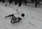 Čekal jsem že bude vypadat podobně jako silnice a bude v pohodě - ale ouha, sníh tu byl ještě z předchozích nadílek a pěkně udusaný a zledovatělý a na něm vrstva čerstvého sněhu. Nějakou dobu jsem jel celkem úspěšně až na občasná náhlá sesednutí. Pak ale přišlo co muselo se stát, jeden smyk jsem už nevybral a skončil po hlavě v příkopu.