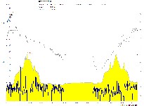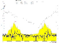 A možná legenda, horní čára je teplota okolí, je vidět že byl hic, ale ráno docela zima. Žlutý je výškový profil, nejel jsem úplně stejnou trasu a tak se trošku liší a ta třetí čára je okamžitá rychlost. Ty pauzy jsou večeře a zasloužený spánek. Celkový čas asi 23 hodin, čas jízdy asi 15 hodin a průměr bez přestávek něco lehce přes 20km/hod.