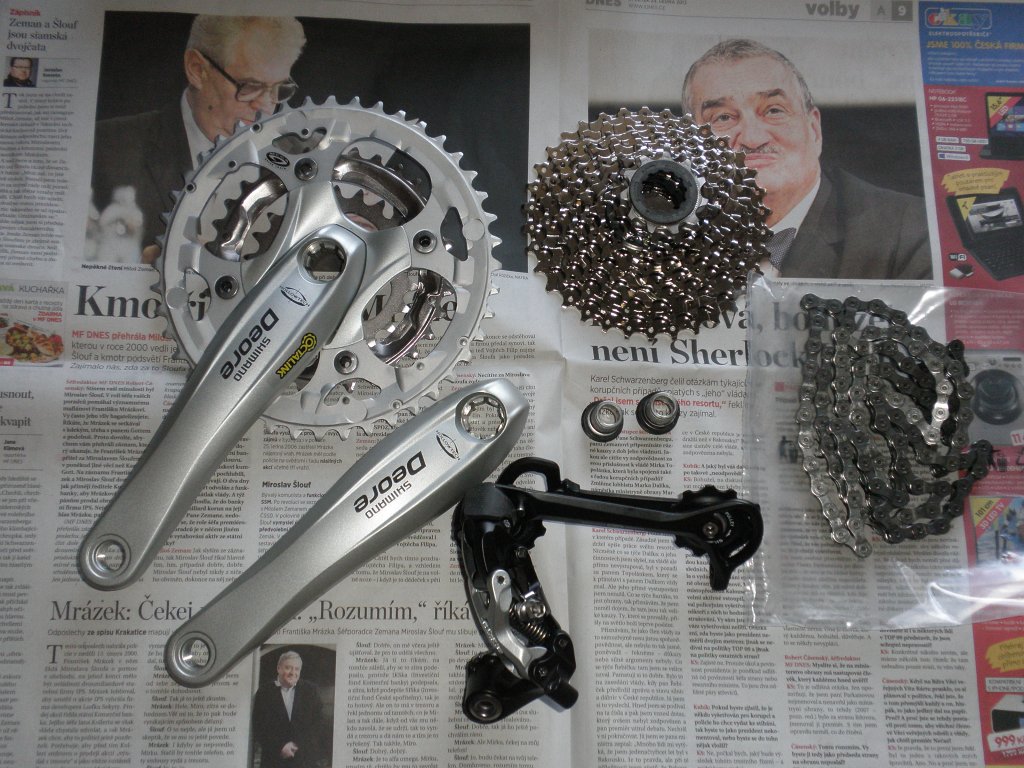 Jak se blíží jarní sezona stále jsem se chystal na rekonstrukci kola po zimě. Mám připraveno mimo jiné nové devítikolečko, přehazovačku, řetěz, trojtác a různé další drobnosti. Ale počasí stále nepřálo - až před týdnem jsem do toho praštil a aby toho nebylo moc najednou tak jsem pro začátek vyměnil řetěz, přehazovačku a devítikolečko + nutná údržba a seřízení. Není třeba se toho bát, byla to lehká práce a seřízení prakticky není třeba - pootočit šroubkem dorazů na přehazovačce. Tak snad pár ilustračních snímků, náhradní díly s prezidentskými kandidáty, uklizený pracovní stůl, stará přehazovačka a kolo v novém.